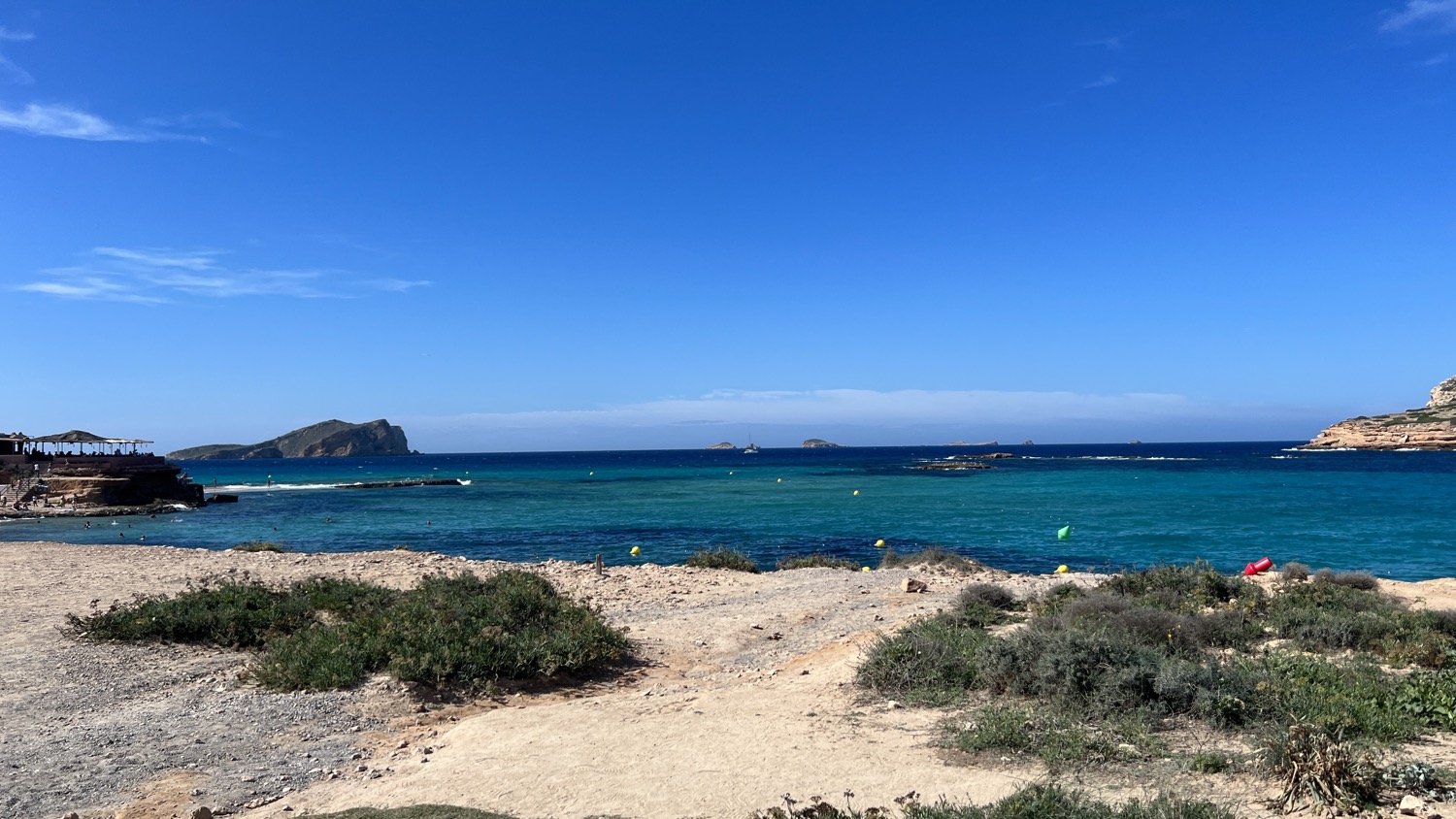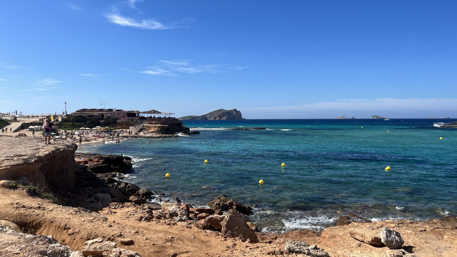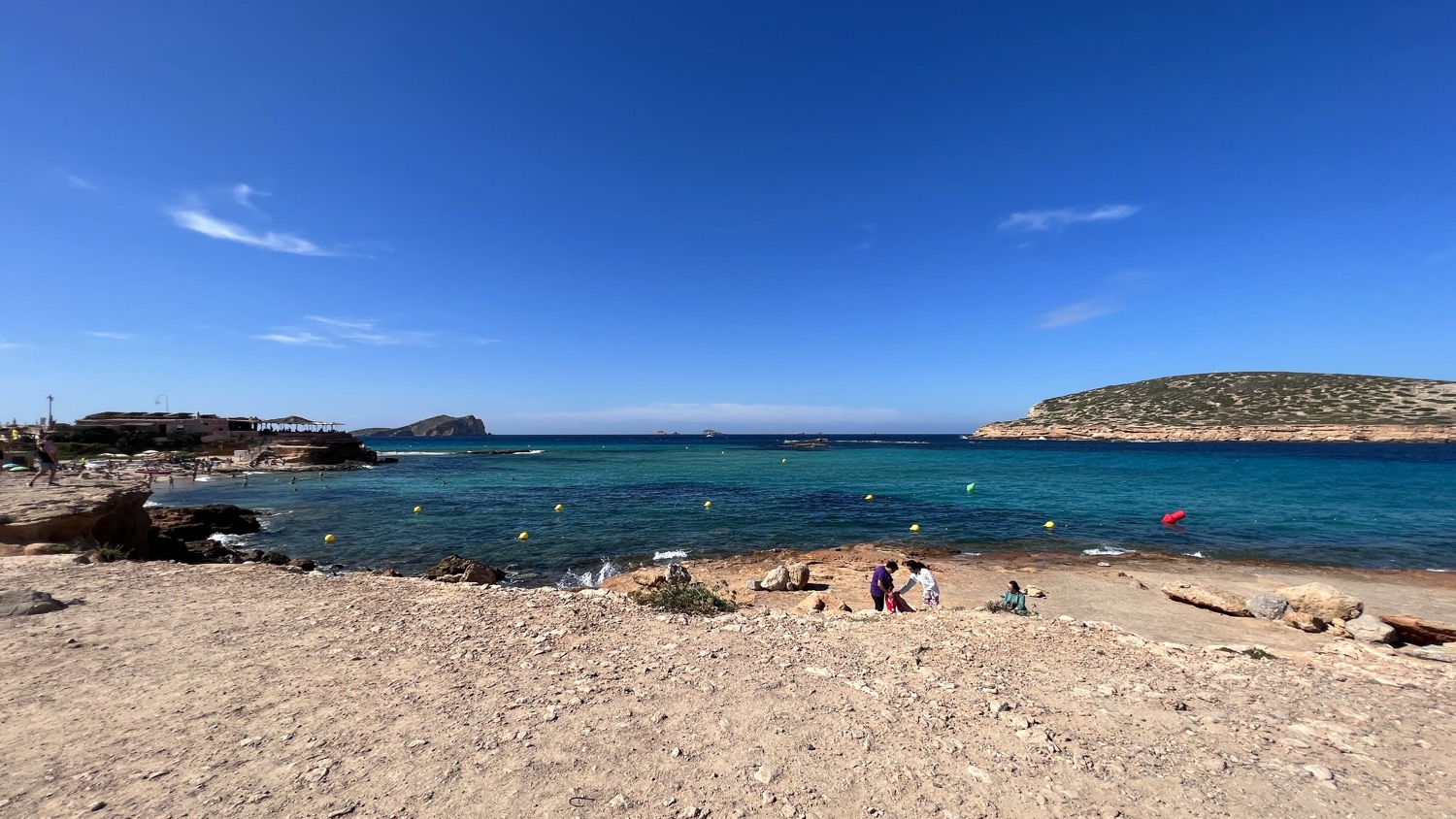 Cala Comte není jen jedna dlouhá pláž, ale spíše soustava několika menších písečných úseků oddělených skalisky. To nejlepší na ní je výhled – přímo před vámi se z moře tyčí malé neobydlené ostrůvky, které vytvářejí úchvatné panorama.