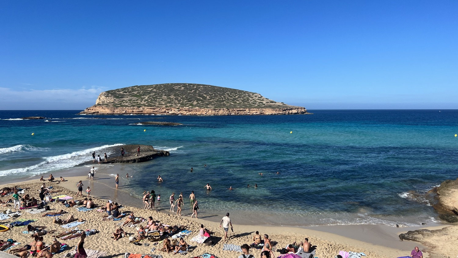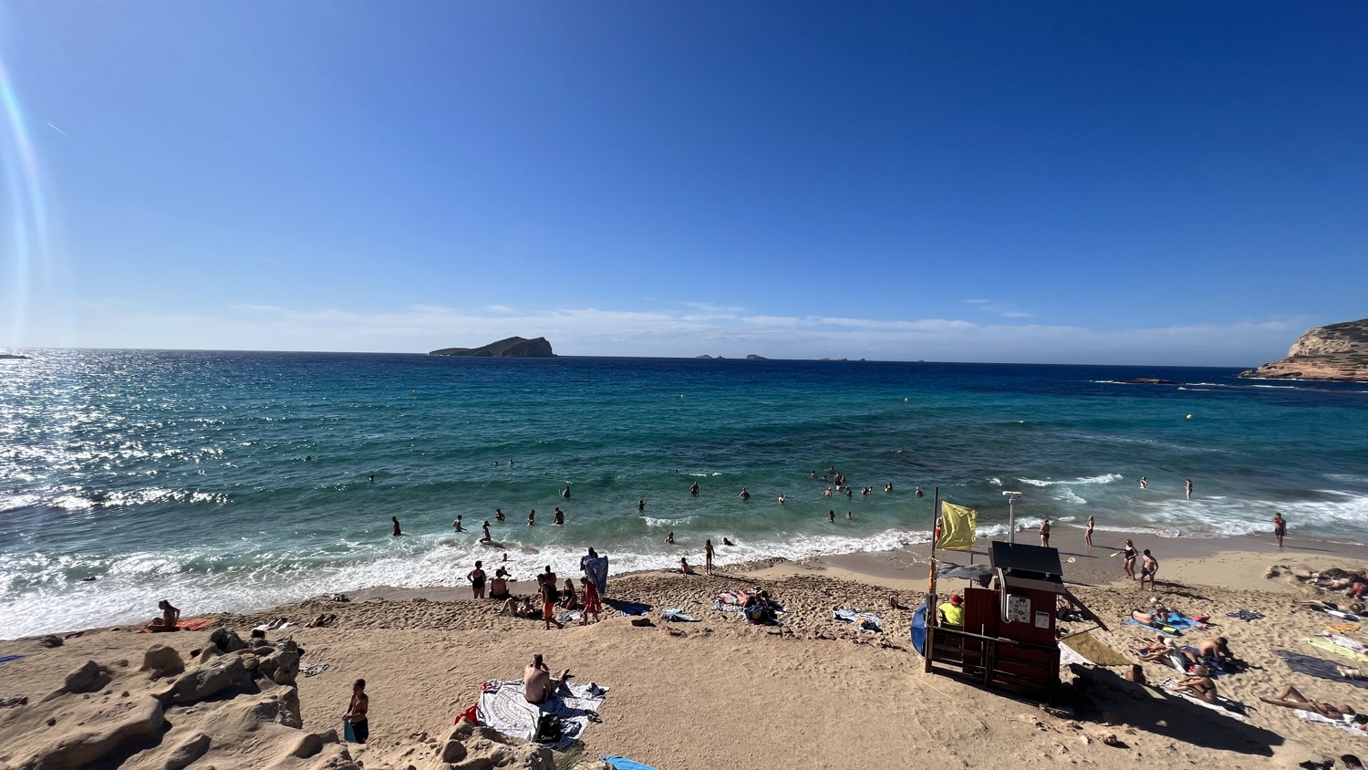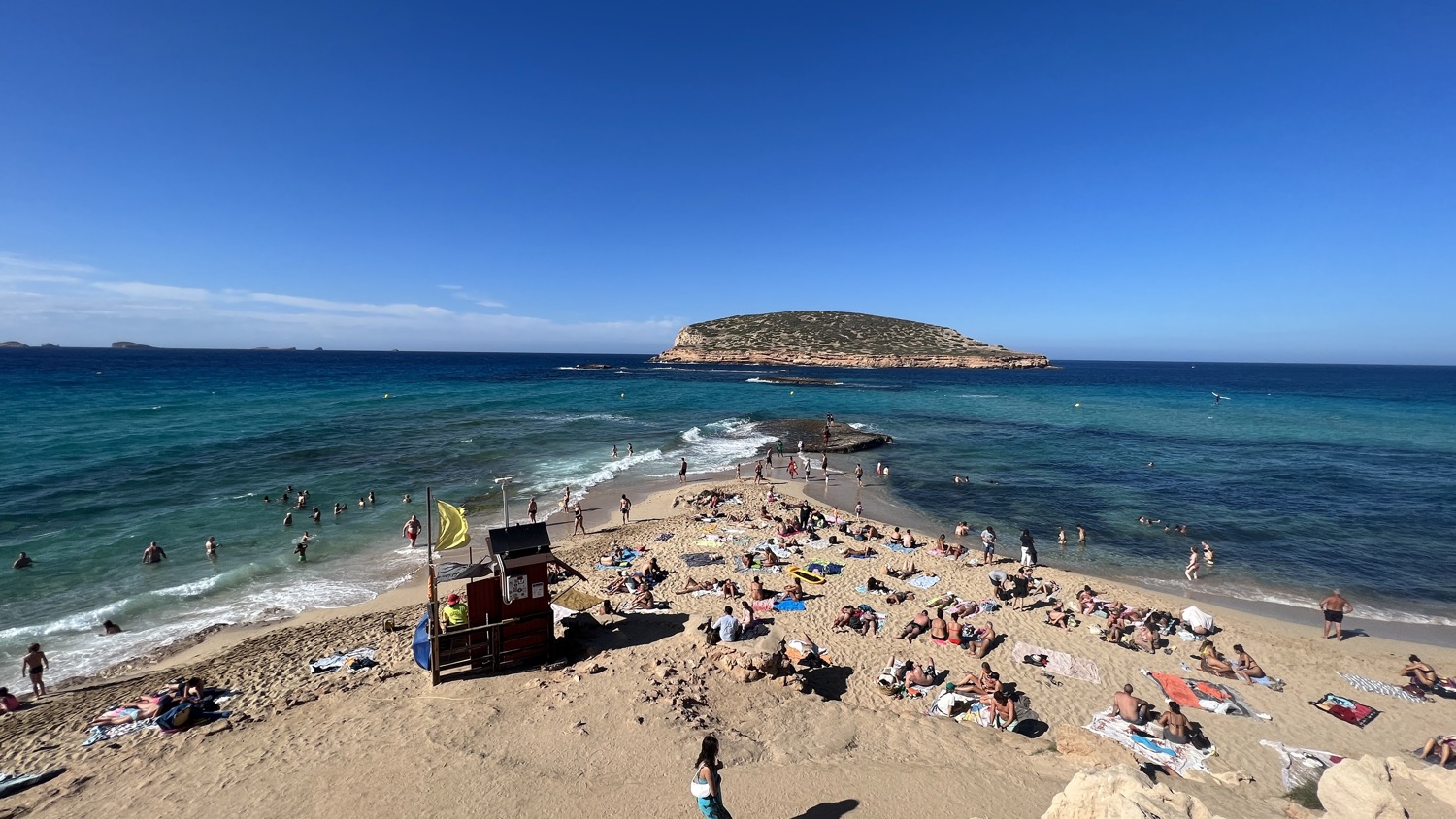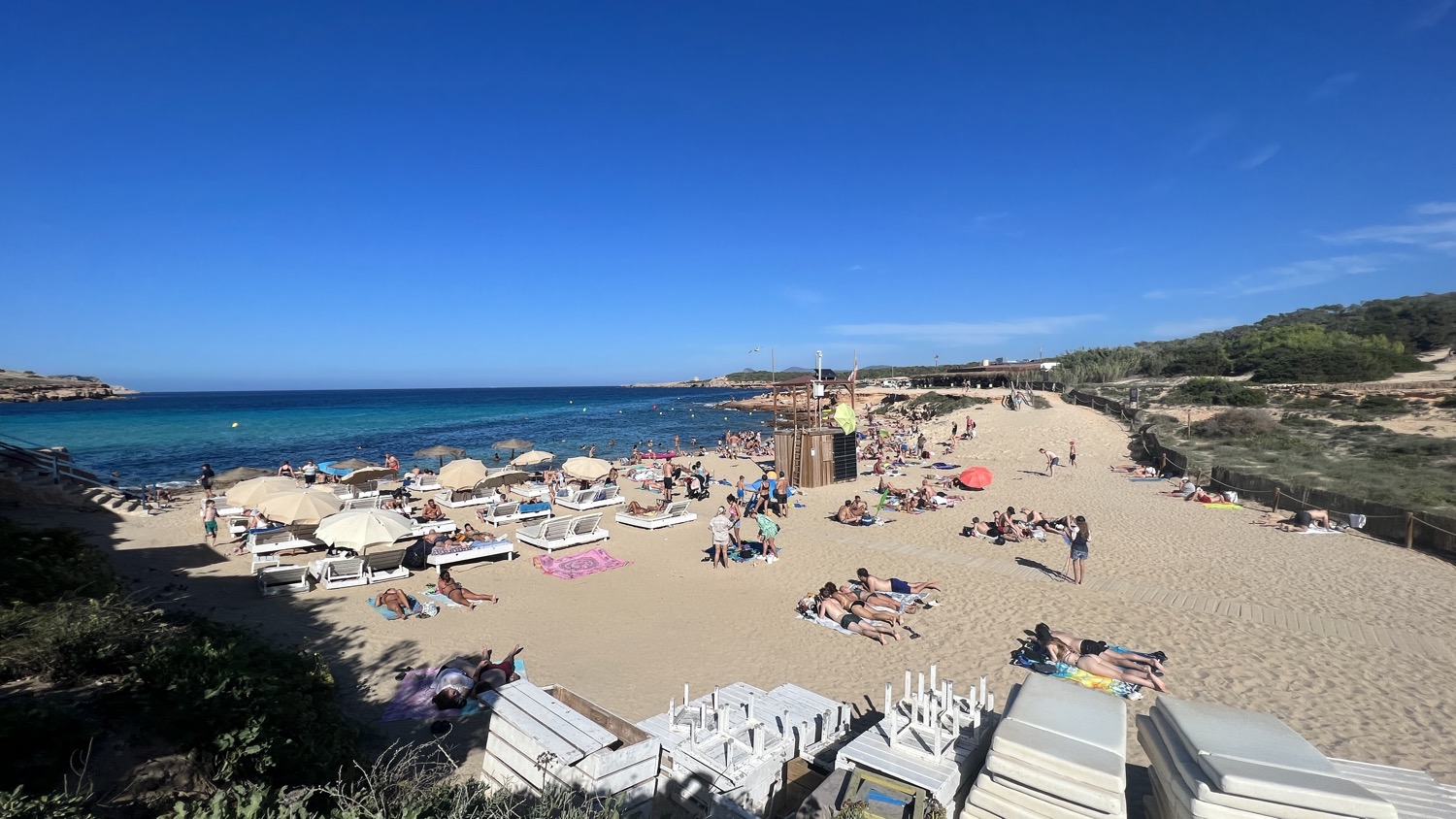 Tady narážíme na největší kámen úrazu Cala Comte. Od června do srpna je tu hlava na hlavě a najít místo na ručník je skoro nadlidský úkol.