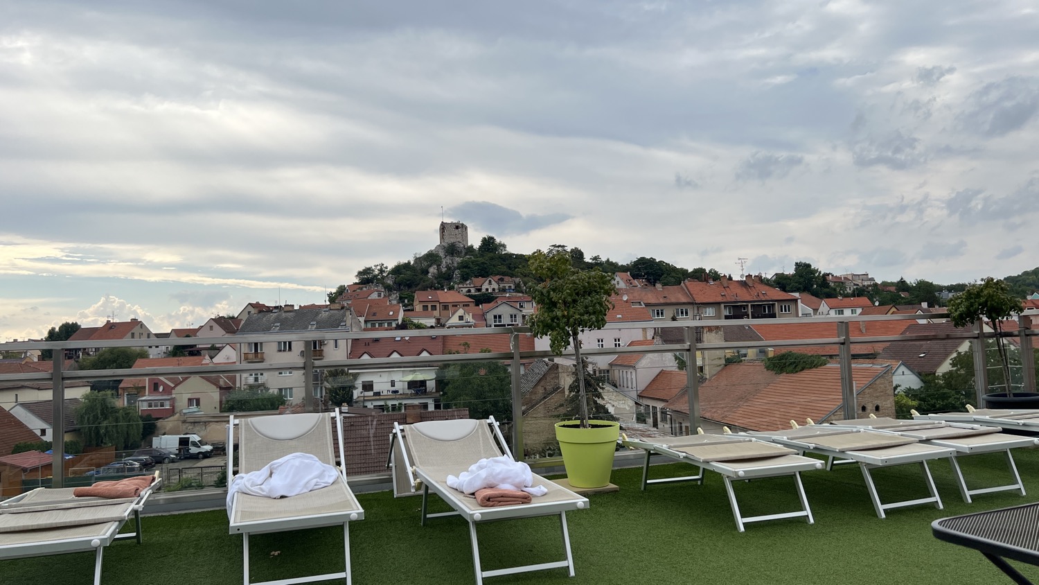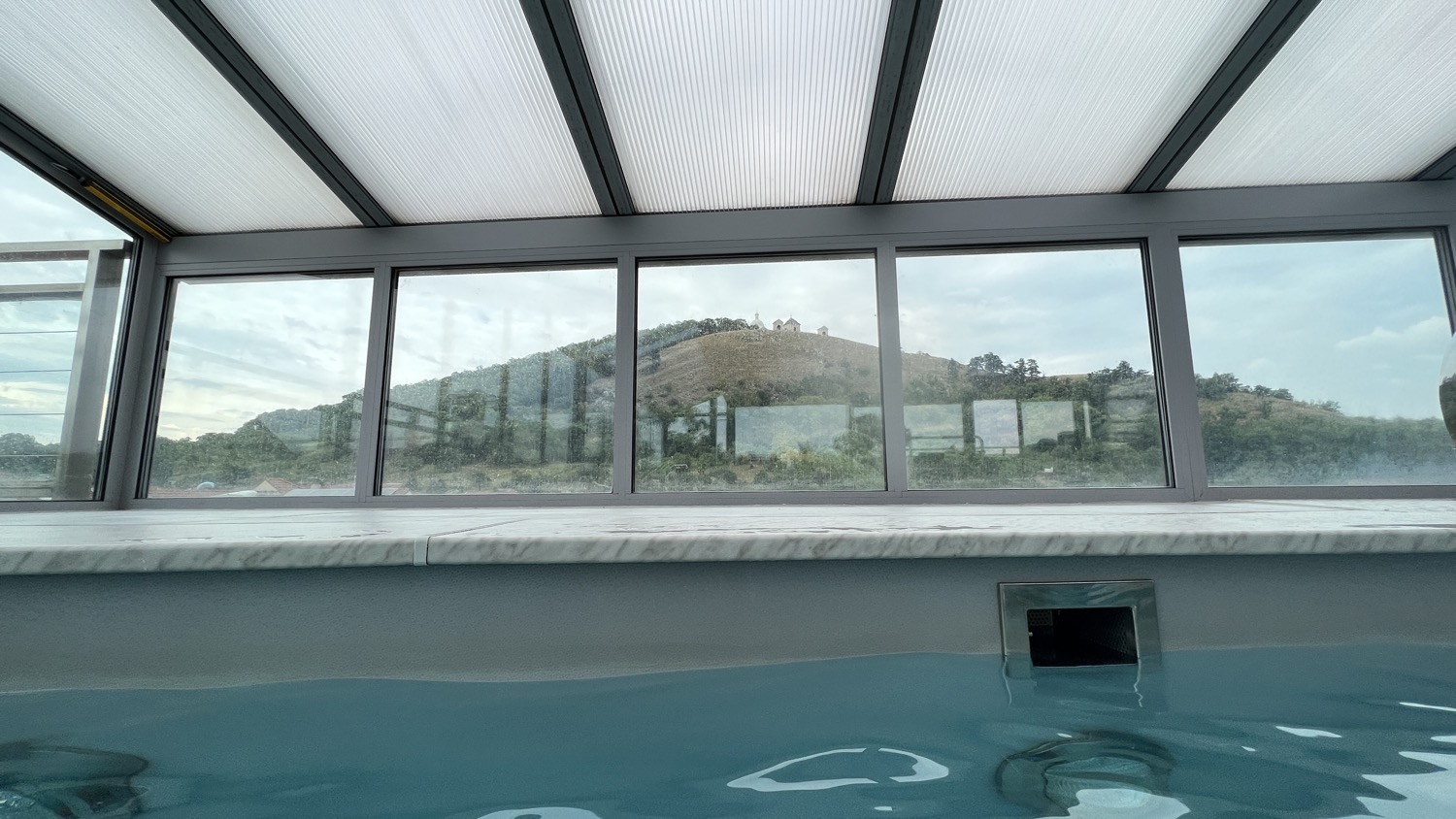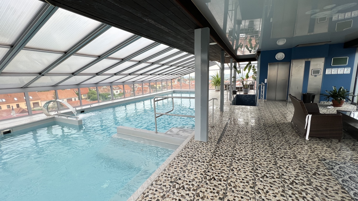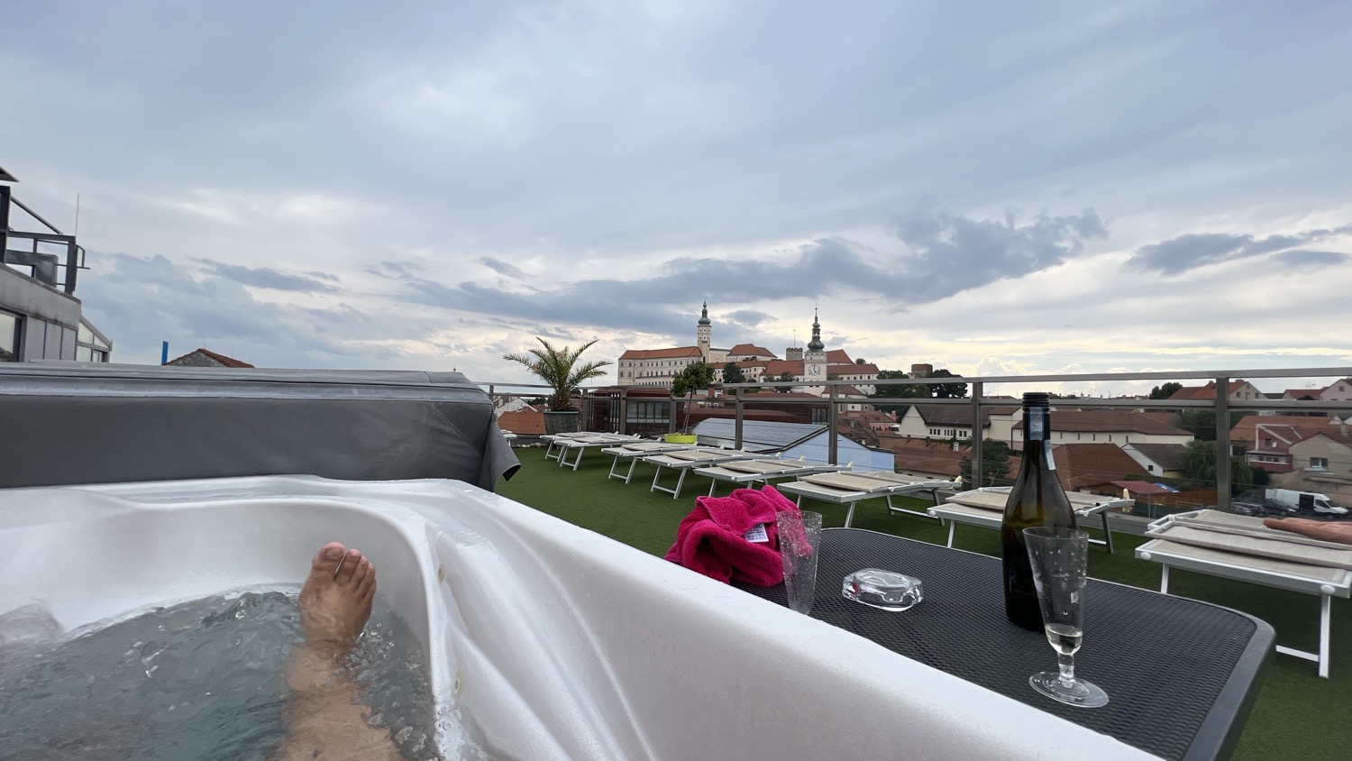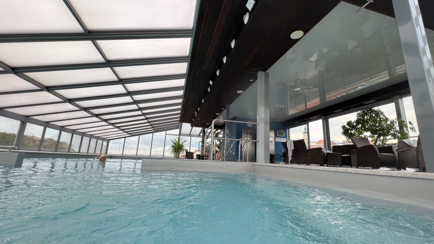 V horní části hotelu se nachází velký bazén, kde plavete a přitom se přes prosklené stěny díváte na panorama celého města. Ale absolutním highlightem jsou střešní vířivky. Sedět v teplých bublinkách, pozorovat siluetu zámku a Svatý kopeček, a přitom pomalu ladit formu na večerní koncerty, je prostě zážitek, který se neomrzí. Je to ta nejlepší příprava, jakou si můžete dopřát.